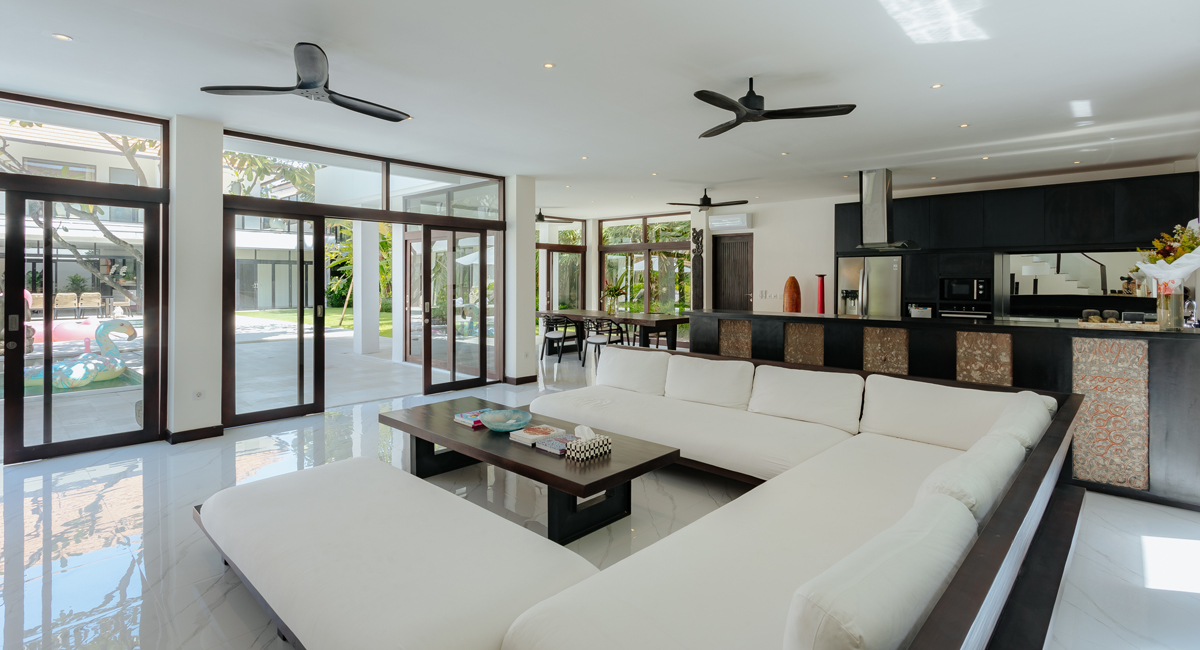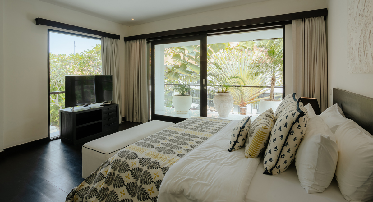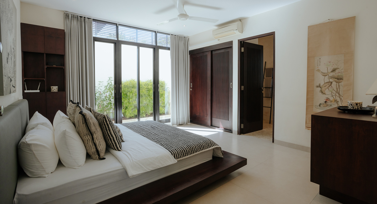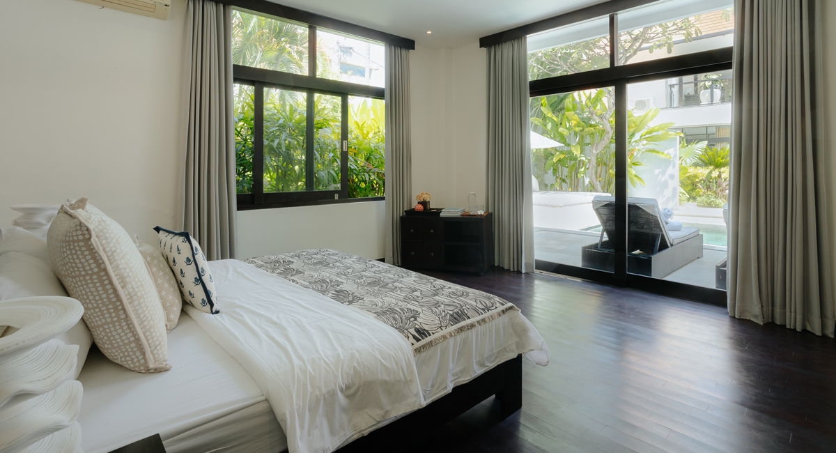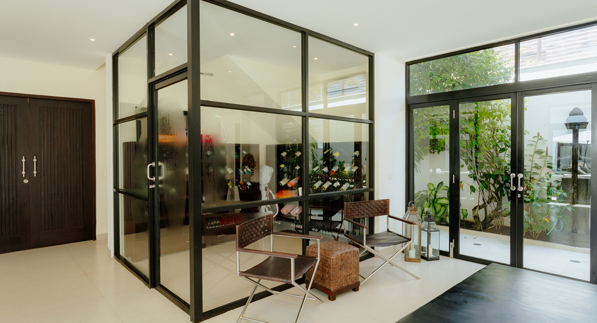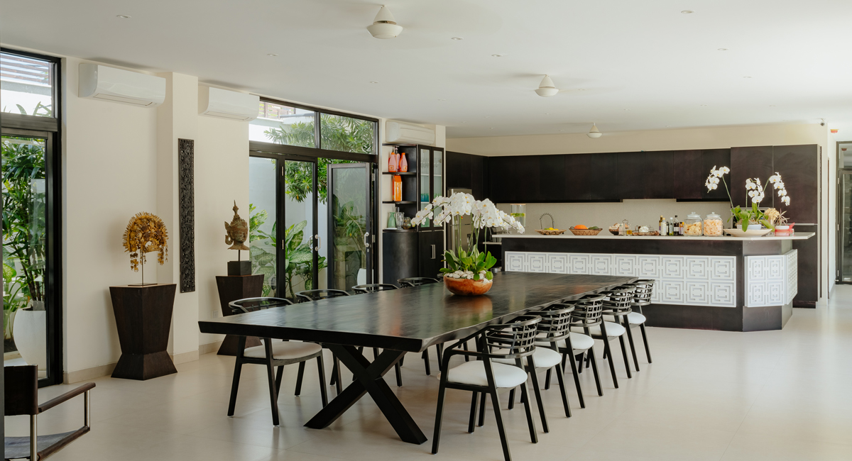 Sleek, spacious interiors draw guests in with pops of natural accents, creating a luxe ambience. The air-conditioned living room, enclosed by expansive glass sliding doors, opens up to the al fresco dining area, two swimming pools, and all the way to the tropical garden. The property also comes with a gym, and a wine cellar in the main villa.