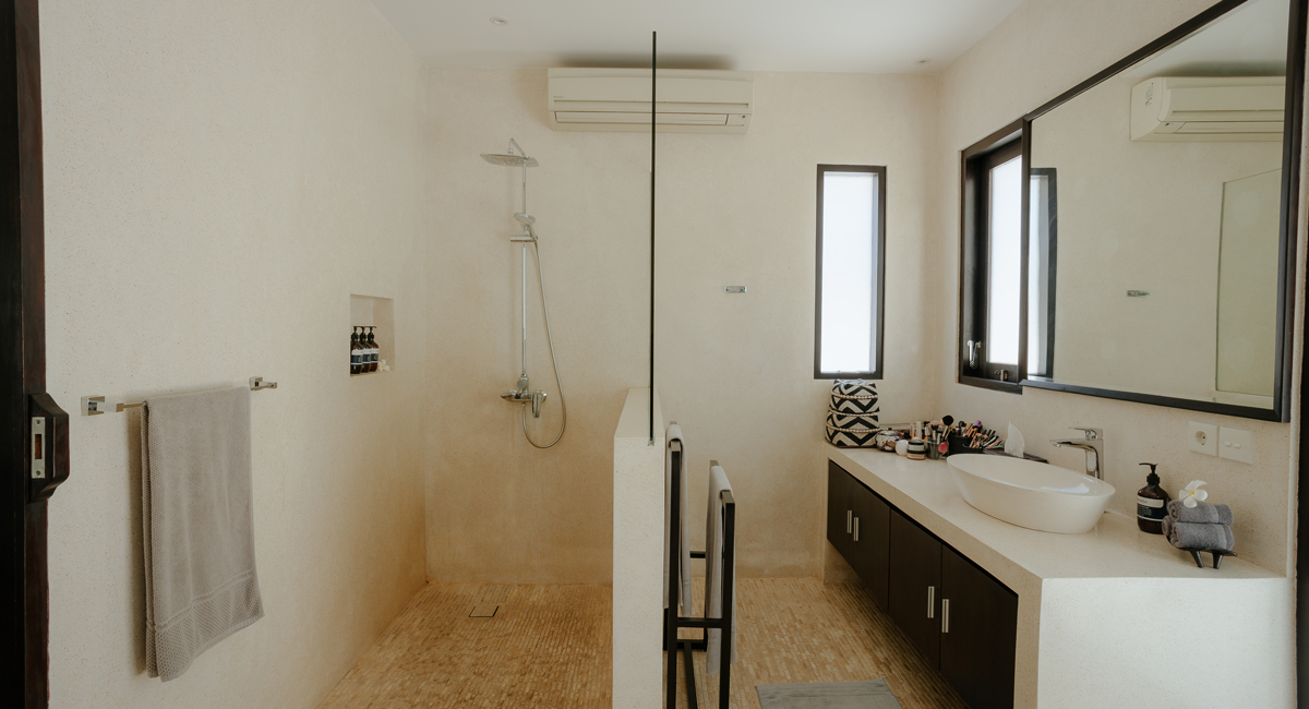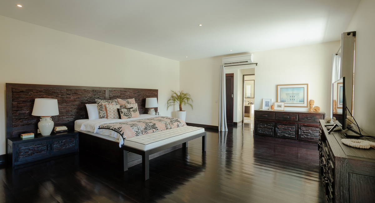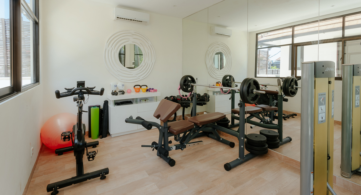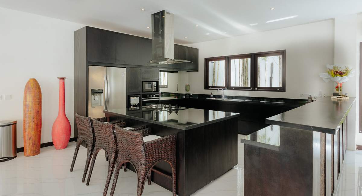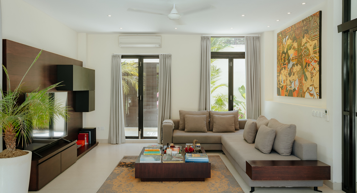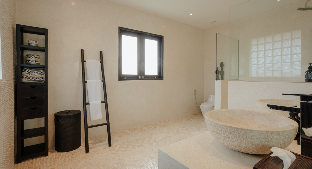 Sleek, spacious interiors draw guests in with pops of natural accents, creating a luxe ambience. The air-conditioned living room, enclosed by expansive glass sliding doors, opens up to the al fresco dining area, two swimming pools, and all the way to the tropical garden. The property also comes with a gym, and a wine cellar in the main villa.