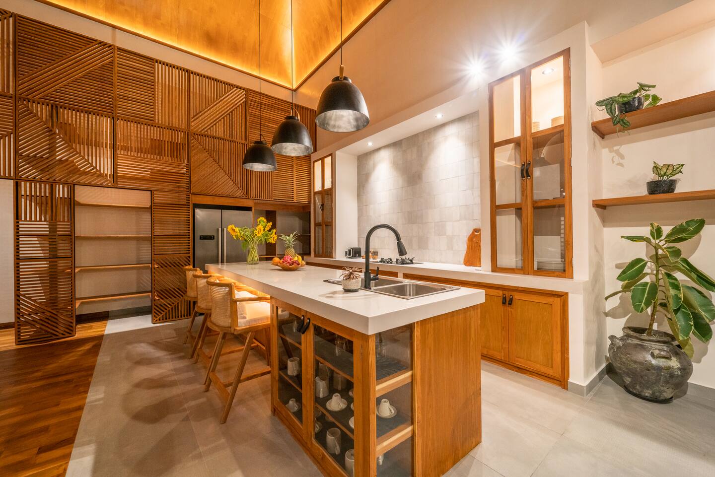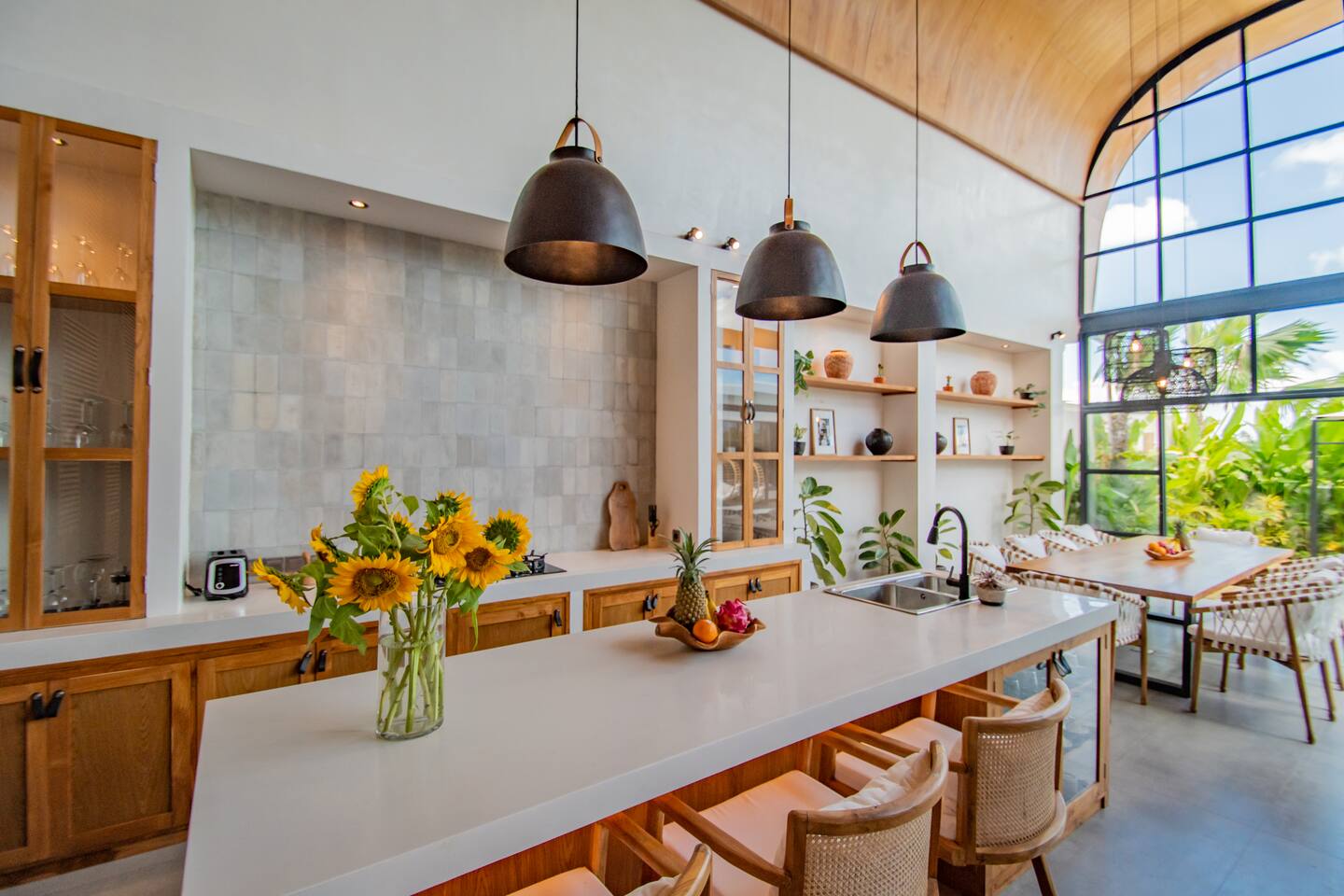 The open-plan living and dining area overlooks a lush tropical garden and a large private pool (14 x 5 meters), creating a serene space to relax, sunbathe, or enjoy al fresco dining. The fully equipped kitchen allows you to prepare meals or request the service of a private chef for a more indulgent experience.